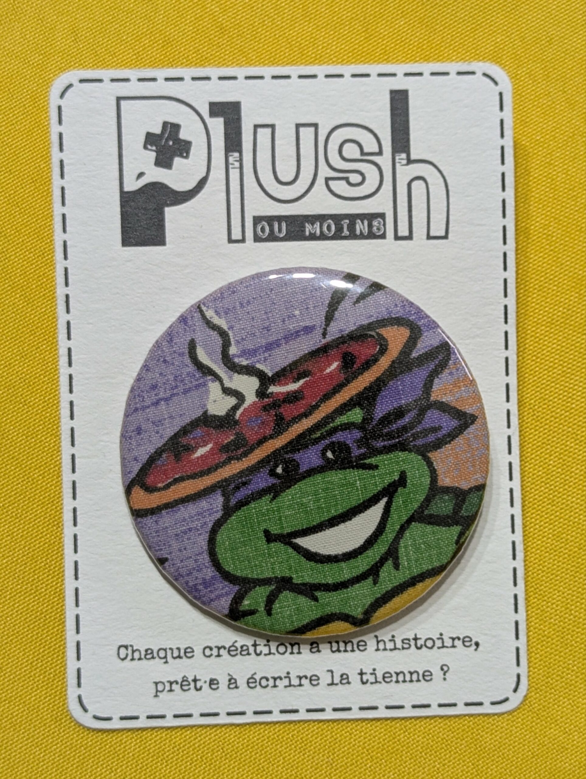 Ce badge upcyclé est né d’un petit bout de tissu rétro qui avait encore beaucoup à raconter. Compact mais plein de caractère, il transforme ton look en un clin d’œil : veste en jean, sac banane, tote-bag, trousse… et t’accompagne partout.