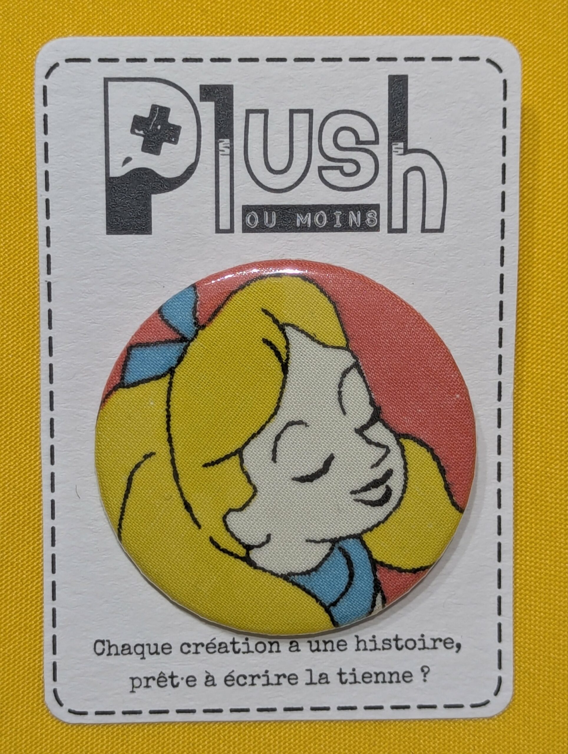 Ce badge upcyclé est né d’un petit bout de tissu rétro qui avait encore beaucoup à raconter. Compact mais plein de caractère, il transforme ton look en un clin d’œil : veste en jean, sac banane, tote-bag, trousse… et t’accompagne partout.