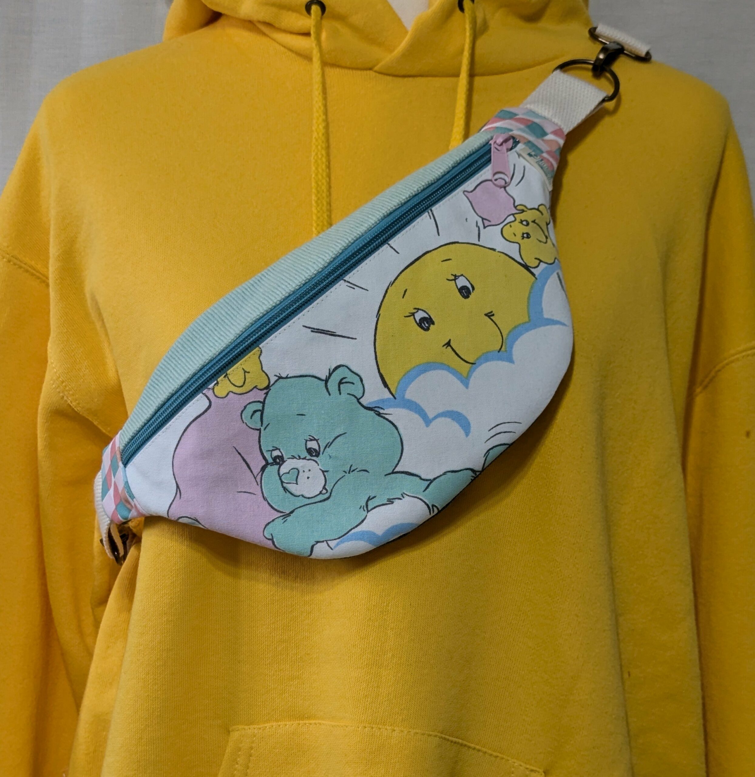 Cette banane est née d’un drap vintage, d’un vêtement oublié ou d’un tissu rétro qui avait soif d’aventure. Elle adore les brocantes, les apéros en terrasse, et elle te suivra partout, même au supermarché.